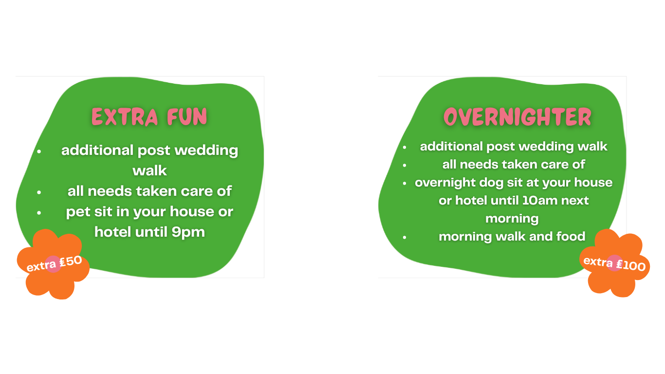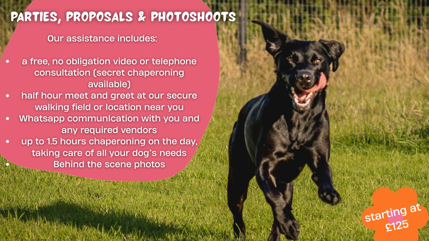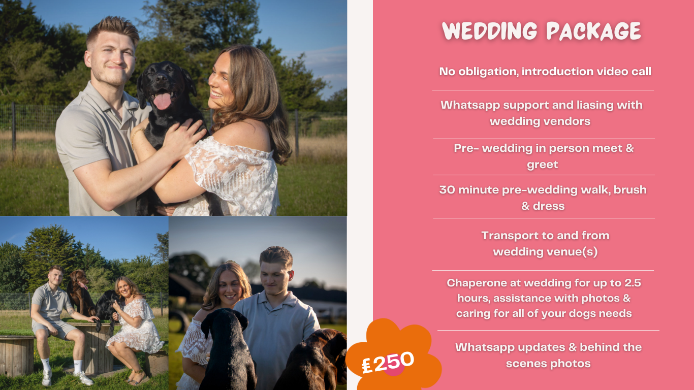 Whether it’s a wedding, engagement, photoshoot or private celebration, we work discreetly behind the scenes, as your dog’s ‘plus one’ to ensure they are calm, cared for, and perfectly coordinated for their moment in the spotlight.